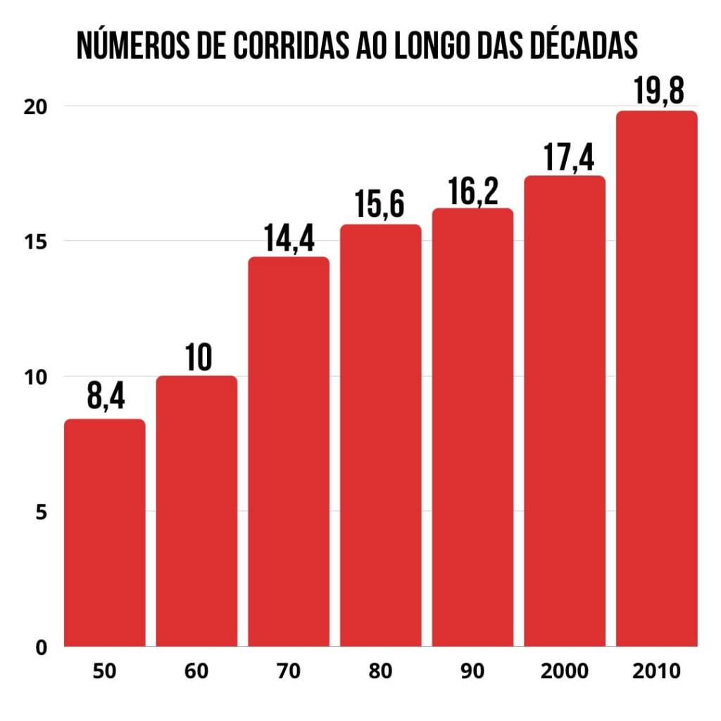 Embora esses números sejam “picados” e não é possível fazer “0,6 corrida”, é perceptível o aumento de década para década. Isso se deve a popularização do esporte e crescente interesse comercial na categoria, pontos interligados.