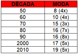 Além da média, a moda (recuperando o conceito de matemática: moda é o número que mais se repete em uma sequência numérica) permite visualizar esse aumento de forma inteira e sem casa decimais. Na década de 1950, a moda era de 8 corridas por temporada. Por sua vez, na década de 60, o número que mais se repetiu foi 10. Já na década de 70, a moda foi 15, um aumento considerável em relação à década anterior. Na década de 80 a moda foi de 16 corridas, número que se repetiu na década seguinte. Nos anos 2000, a moda subiu um ponto, indo a 17. Já na década de 2010, o aumento foi de dois pontos, indo a 19.