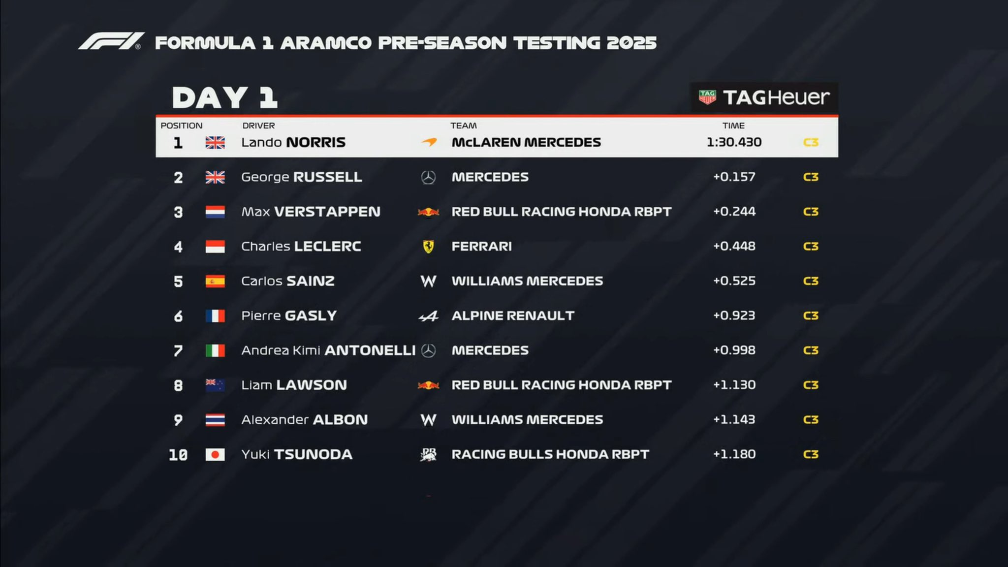 Mas é claro, e como já nos cansamos de repetir aqui: Os tempos não são importantes nos testes pré-temporada, muito menos no primeiro dia. As equipes testam de tudo, e acreditem, o último “check” da lista é o de fazer um tempo rápido. Isso geralmente fica lá pra última sessão (a parte vespertina da sexta), e olhe lá.