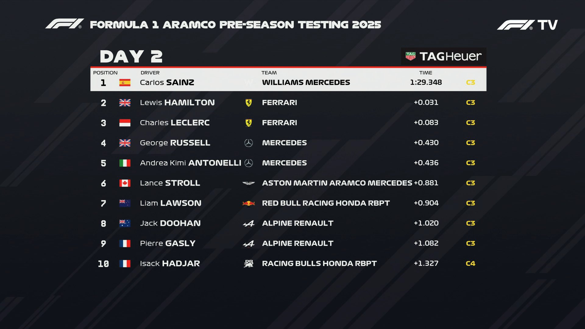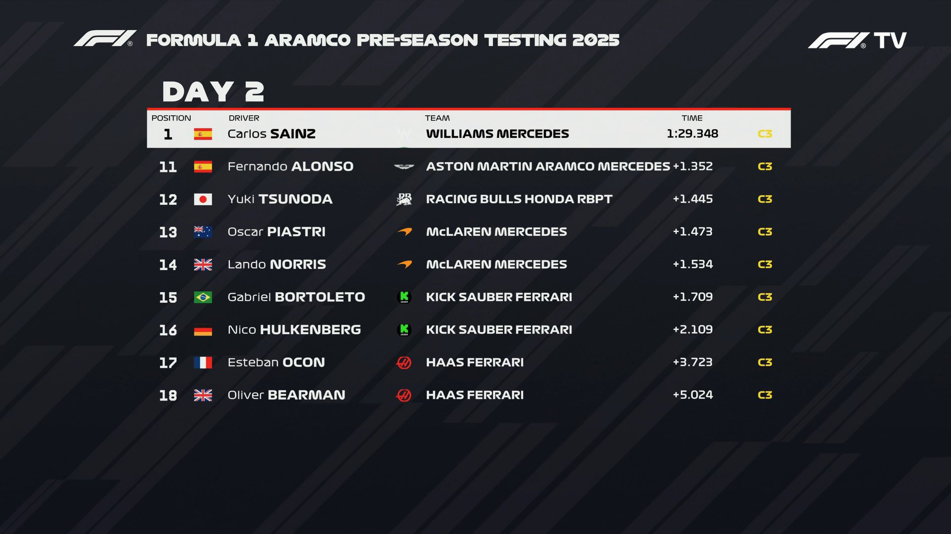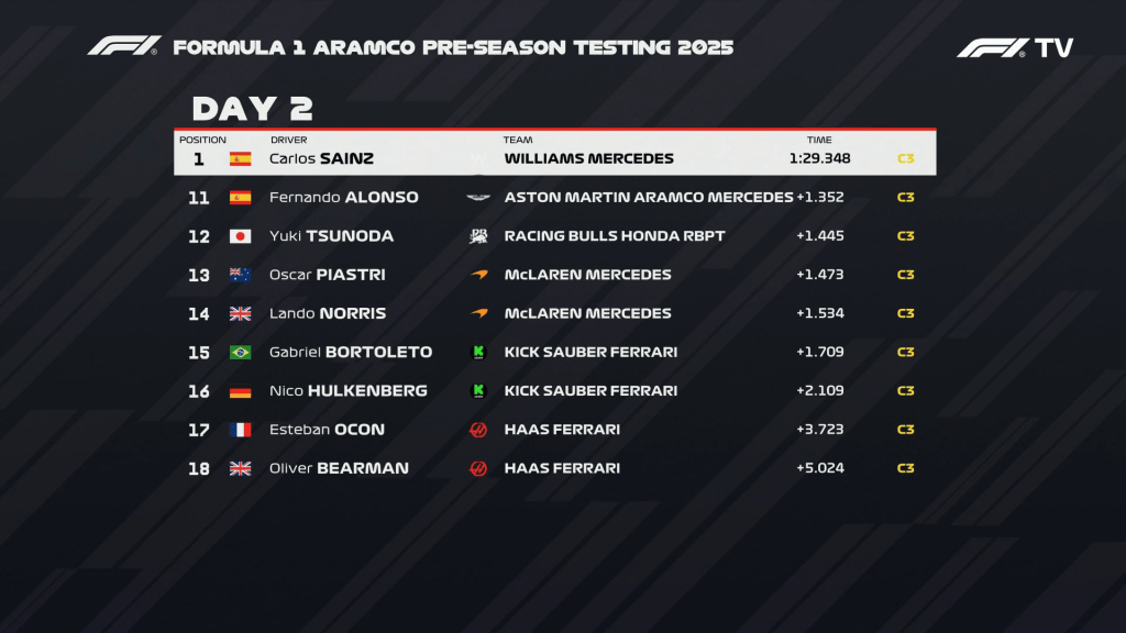Podemos dizer que esse segundo dia de testes no circuito de Sakhir foi menos caótico do que o primeiro (pelo menos não faltou energia elétrica). A Williams não quis saber de ficar parada e fez Sainz trabalhar: Simplesmente 127 voltas percorridas e, de quebra, o melhor tempo do dia!