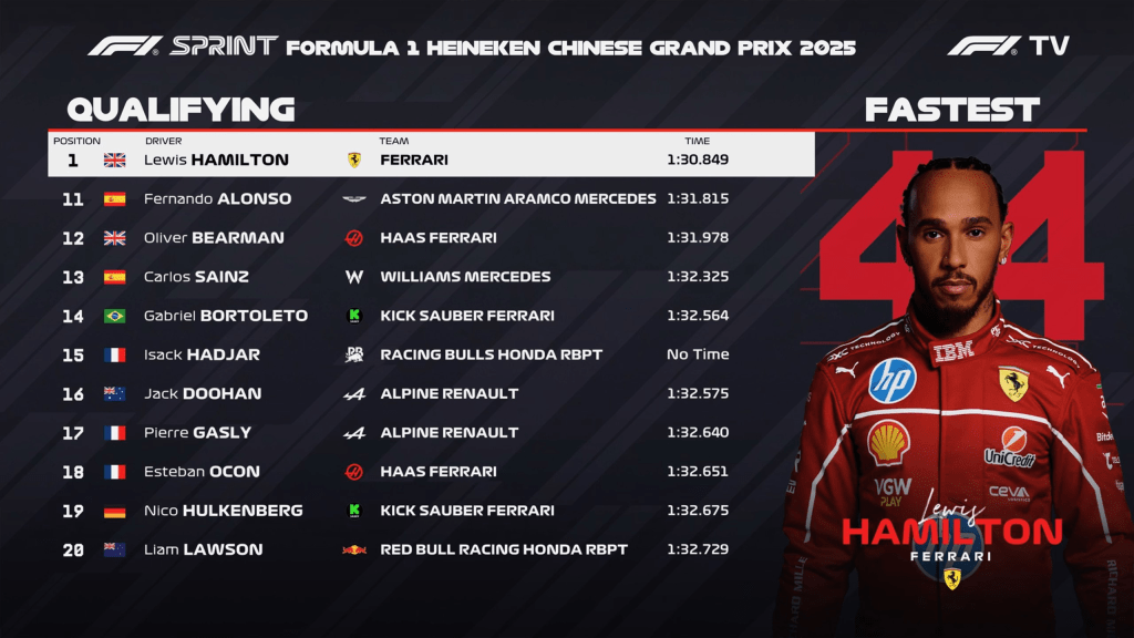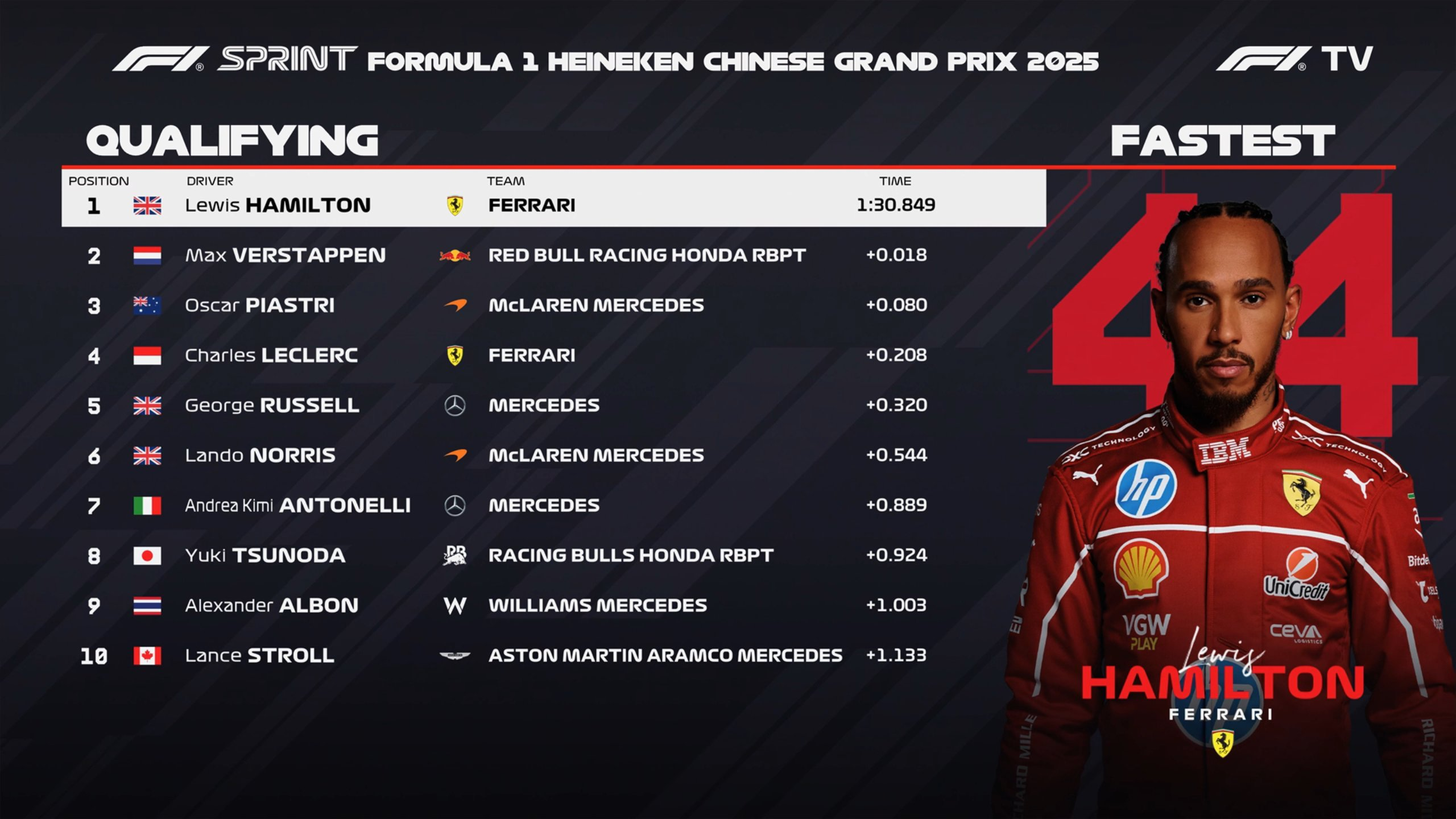 O SQ3 nos trouxe a primeira vez de Lewis Hamilton em P1 com as cores da Ferrari: Com um tempo de 1:30.849 (onboard AQUI), o heptacampeão conseguiu derrotar seus principais rivais e largará em primeiro na sprint desse sábado. Max Verstappen chegou muito perto, mas acabou ficando em segundo. Piastri também ficou bastante próximo, a apenas 0.080. Lando Norris errou na sua volta lançada e amargurou apenas um P6 no grid.