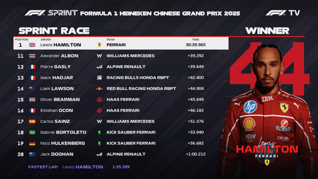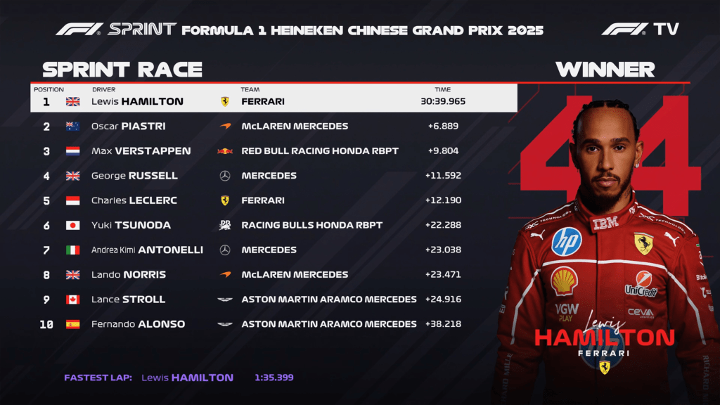 E a primeira vitória de Lewis Hamilton na Ferrari chegou bem antes do esperado: Ela veio nesta madrugada de sábado do Brasil, com o P1 na sprint race do GP da China. A marca é extraoficial, já que não conta nos números oficiais da F1, por se tratar de uma sprint.