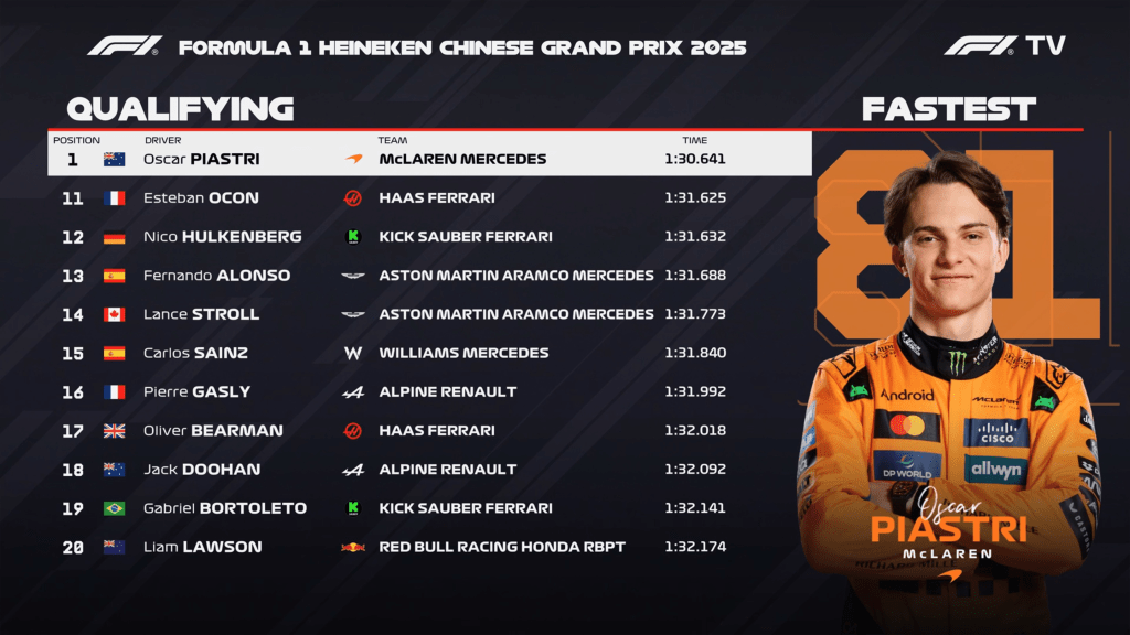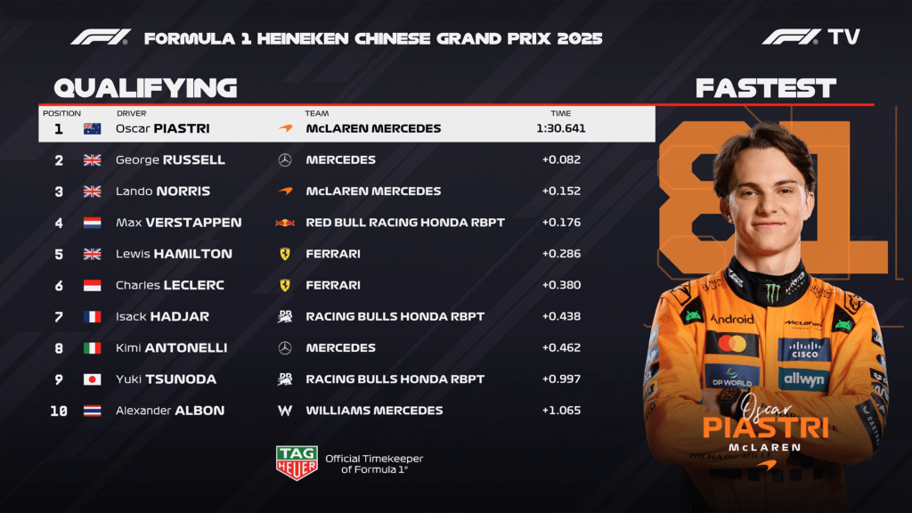Oscar Piastri: “No Q3 encontrei muito ritmo, no Q1 e Q2 eu estava realmente lutando com o carro. Ele ganhou vida no Q3 e eu também. Estou muito animado por estar na pole, estou muito feliz. Fiz a volta mais rápida de Xangai! Fiquei muito feliz depois da Sprint, sinto que aprendemos muito e estou ansioso para colocar isso em prática amanhã”