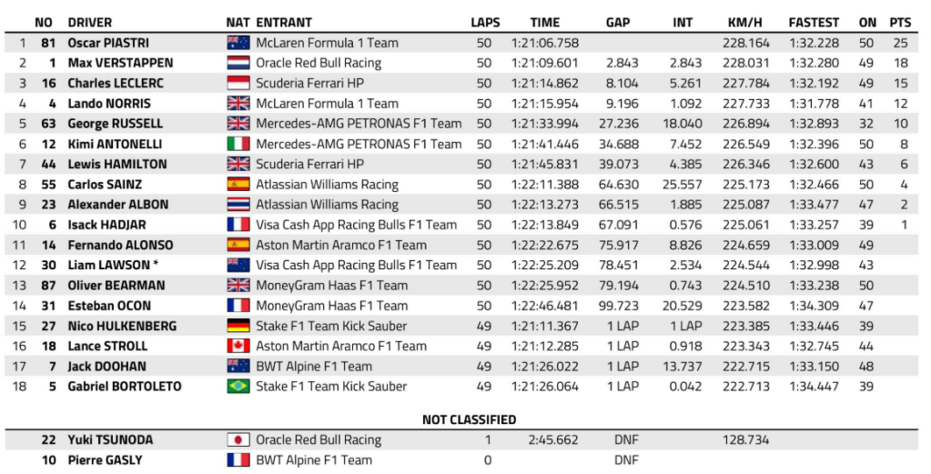 Vitória sólida de Oscar Piastri, que assume a liderança do campeonato pela primeira vez na carreira! Verstappen conquistou um ótimo P2 e Leclerc trouxe o primeiro pódio para a Ferrari em 2025.