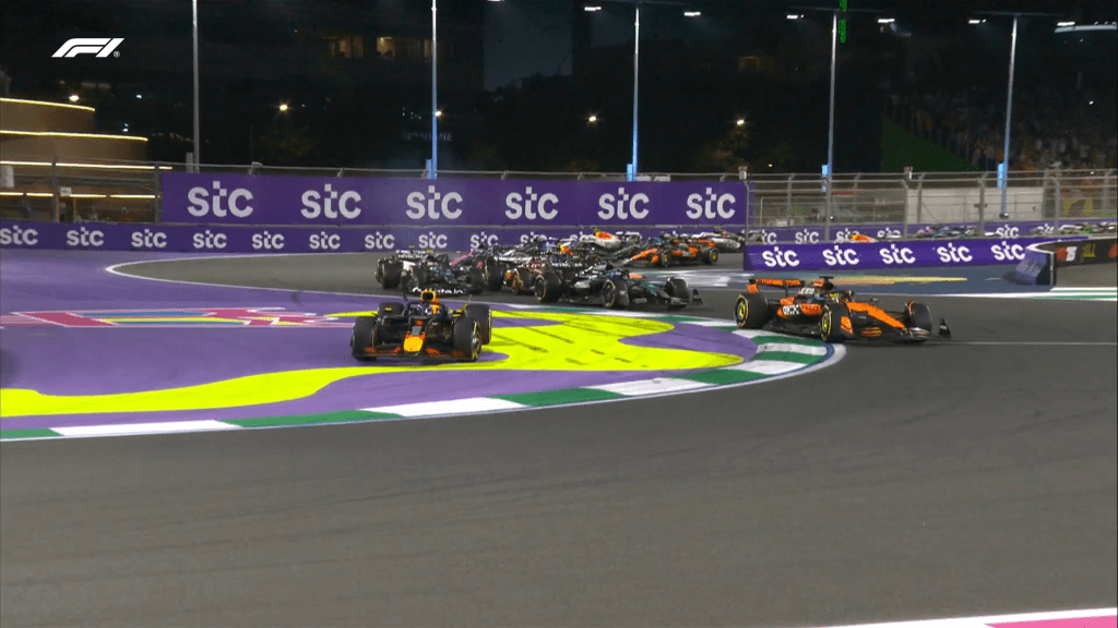 A corrida começou bem movimentada, com emoções na frente e lá atrás: Na ponta, Verstappen e Piastri disputaram a liderança lado a lado e, na primeira curva, Verstappen cortou a chicane, mantendo o P1. A manobra foi investigada pela direção da prova e Max foi punido com 5 segundos por ter ganhado vantagem por fora do traçado (ele iria cumprir essa punição durante o seu pit stop na volta 22).