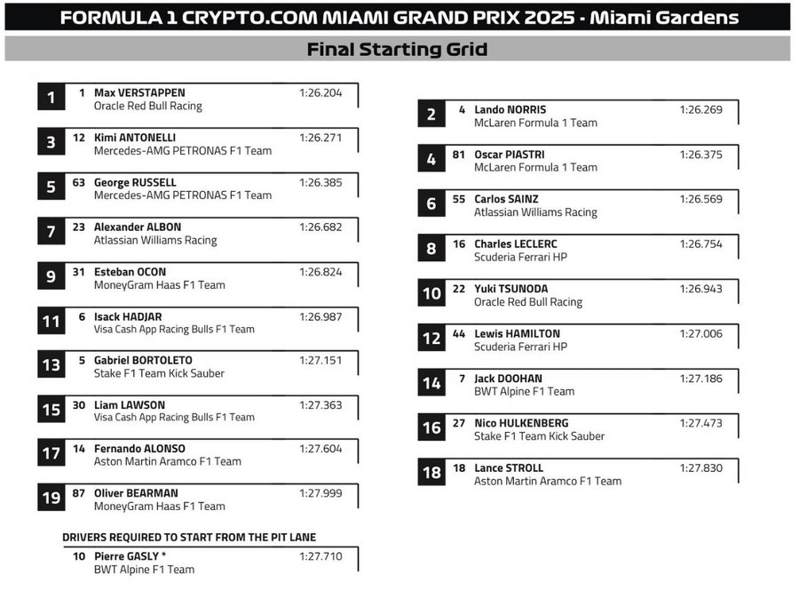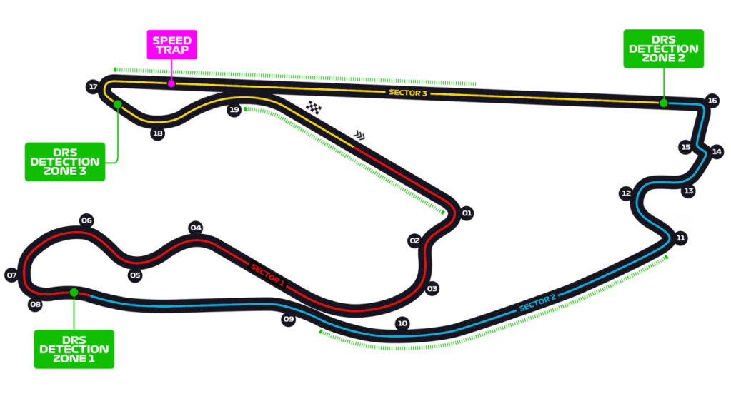 O GP de Miami ocorre no Miami International Autodrome. Serão 57 voltas no traçado de 5,412 km, que conta com 19 curvas e três zonas de ativação do DRS (Drag Reduction System).