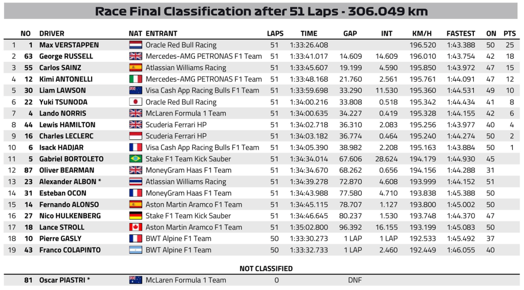 Numa corrida morna marcada pela batida e abandono de Oscar Piastri na primeira volta, Max Verstappen não teve dificuldades e venceu de forma confortável pela segunda vez consecutiva nesse ano. Lando Norris foi apenas P7 e, com isso, Max se coloca a 69 pontos de distância do líder do campeonato, Piastri. Será que ele vai buscar?