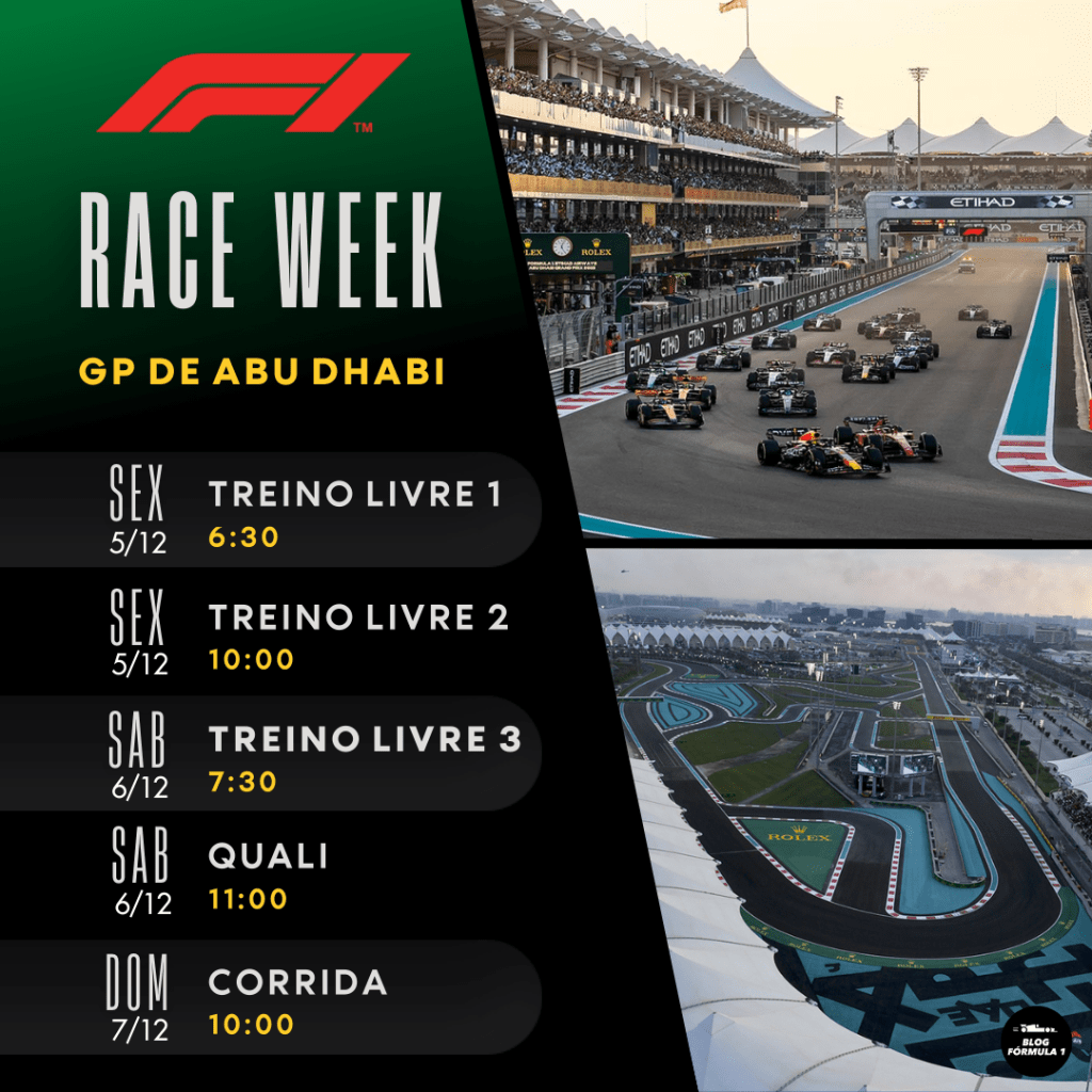 O GP de Abu Dhabi é a 24º e última etapa do calendário da atual temporada, que tem como líder Lando Norris, da McLaren, com 408 pontos (confira a tabela completa AQUI). Max Verstappen (396) e Oscar Piastri (392) também tem chances de se sagrarem campeões: Confira AQUI todas as possibilidades matemáticas pra cada um dos protagonistas.